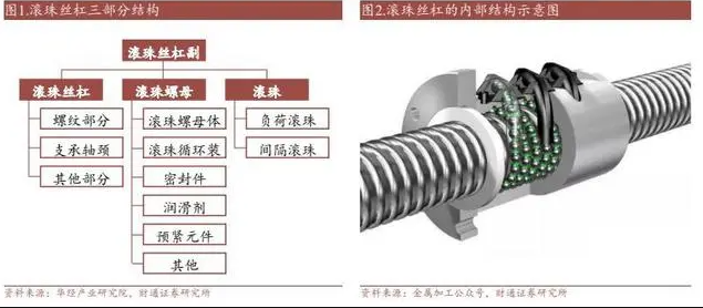 滾珠絲杠,又名滾珠絲杠副,是工業(yè)精密機(jī)械中常用的傳動(dòng)元件,其主要結(jié)構(gòu)包括滾珠絲杠、滾珠螺母、滾珠三部分。滾珠絲杠軸為螺母運(yùn)動(dòng)的導(dǎo)向軸,其表面具有螺紋,滾珠在螺紋內(nèi)運(yùn)動(dòng)。螺母由預(yù)壓片、反向器、防塵器等組成,是直線運(yùn)動(dòng)的移動(dòng)體,帶動(dòng)滾珠循環(huán)機(jī)制;其端部密封件用于封裝潤(rùn)滑零件、防止異物進(jìn)入。滾珠是利用低摩擦系數(shù)維持整個(gè)零部件運(yùn)轉(zhuǎn)的媒介,存在外循環(huán)、內(nèi)循環(huán)兩種循環(huán)方式。