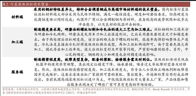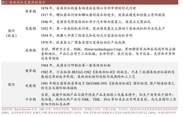 國(guó)內(nèi)外滾珠絲杠發(fā)展階段迥異,國(guó)內(nèi)滾珠絲杠生產(chǎn)技術(shù)正逐步向國(guó)外追趕。滾珠絲杠在國(guó)外起步早、發(fā)展快、技術(shù)成熟,歐美市場(chǎng)在高端滾珠絲杠制造領(lǐng)域占據(jù)壟斷地位,并且廣泛應(yīng)用到各領(lǐng)域;在國(guó)內(nèi)發(fā)展迅速,市場(chǎng)規(guī)模快速增長(zhǎng),同時(shí)國(guó)內(nèi)大型生產(chǎn)企業(yè)技術(shù)逐漸提升,有望逐步實(shí)現(xiàn)國(guó)產(chǎn)替代。