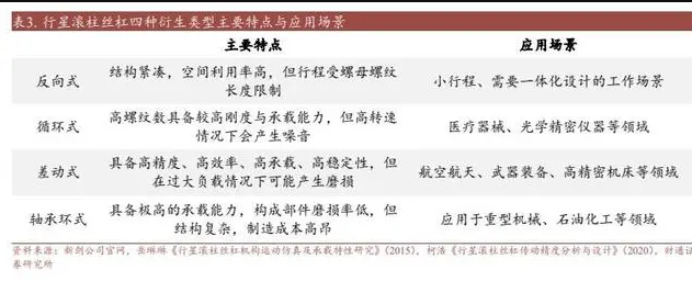 行星滾柱絲杠在標(biāo)準(zhǔn)式基礎(chǔ)上衍生出四種類(lèi)型,它們?cè)诮Y(jié)構(gòu)和功能上具有不同的特點(diǎn),從而適用于不同的應(yīng)用場(chǎng)景。