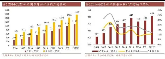 近年來(lái)國(guó)內(nèi)滾珠絲杠下游需求穩(wěn)步增長(zhǎng),產(chǎn)能端加速釋放。根據(jù)華經(jīng)產(chǎn)業(yè)研究院數(shù)據(jù),我國(guó)滾珠絲杠產(chǎn)需量缺口在 2014 年至 2021 年間由 307 萬(wàn)套上升至 423萬(wàn)套,預(yù)估 2022 年產(chǎn)需缺口為 455 萬(wàn)套。2014 年至 2021 年產(chǎn)需缺口年均復(fù)合增長(zhǎng)率約為 4.69%。當(dāng)前國(guó)內(nèi)滾珠絲杠產(chǎn)量增長(zhǎng)速度逐漸趨于放緩,由高速增長(zhǎng)逐步轉(zhuǎn)型為中低速增長(zhǎng),需求量繼續(xù)保持增長(zhǎng)。未來(lái)隨我國(guó)高端裝備制造業(yè)不斷發(fā)展,相關(guān)設(shè)備的精密傳動(dòng)需求將不斷加大,對(duì)于滾珠絲杠大規(guī)模量產(chǎn)能力的要求將進(jìn)一步提高,或繼續(xù)刺激產(chǎn)能釋放。
