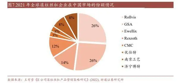 從我國(guó)滾動(dòng)功能部件的市場(chǎng)格局來(lái)看,日本、歐洲企業(yè)主導(dǎo)高端市場(chǎng),中國(guó)企業(yè)仍有進(jìn)步空間。根據(jù)金屬加工公眾號(hào)信息,在國(guó)內(nèi)滾動(dòng)功能部件的高端市場(chǎng),日本、歐洲企業(yè)合計(jì)市場(chǎng)份額高達(dá) 90%,中國(guó)大陸、中國(guó)臺(tái)灣企業(yè)市場(chǎng)份額各約5%,高端市場(chǎng)格局相對(duì)集中;在國(guó)內(nèi)滾動(dòng)功能部件的中低端市場(chǎng),中國(guó)大陸廠商的市場(chǎng)份額約 30%。根據(jù)王有雪論文《E 公司滾柱絲杠產(chǎn)品營(yíng)銷(xiāo)策略研究》論述,2021 年我國(guó)行星滾柱絲杠市場(chǎng)供應(yīng)量排名前四的廠家分別是 Rollvis(瑞士)、GSA(瑞士)、Ewellix(瑞典)Rexroth(德國(guó)),市占率分別為 26%、26%、14%,12%。對(duì)于行星滾柱絲杠,由于市場(chǎng)較小,行業(yè)參與者主要以海外企業(yè)為主,主要包括斯凱孚、GSA、伊維萊(Ewellix)、博世力士樂(lè)等。